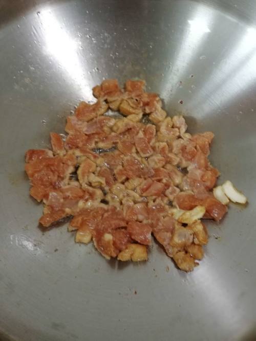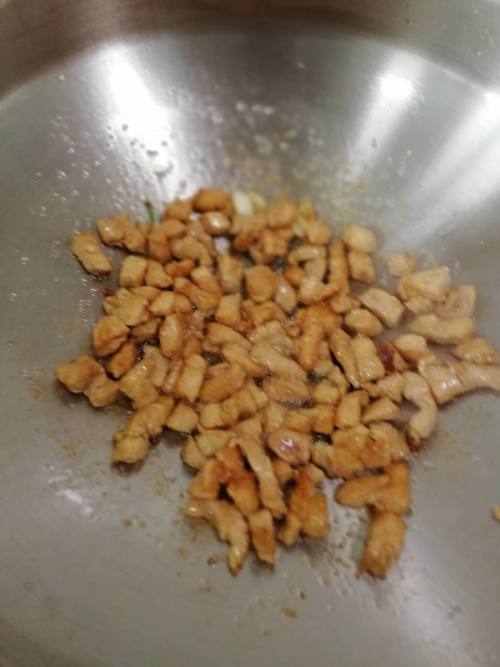 鸡胸肉切丁,加酱油、淀粉腌制一会。