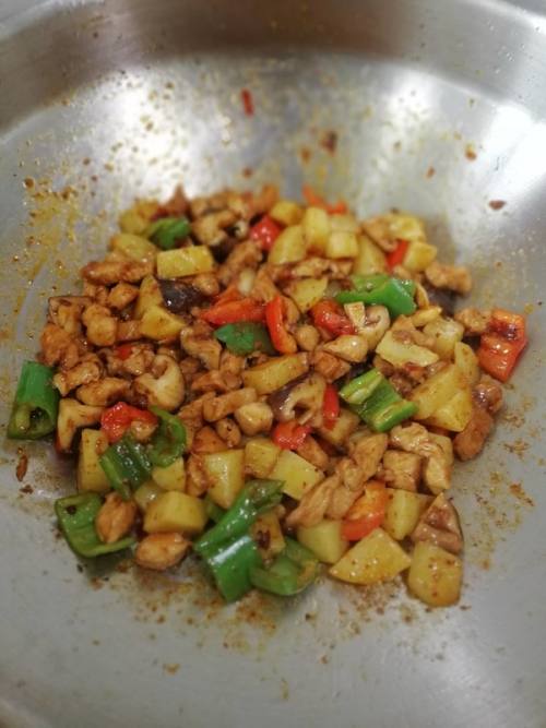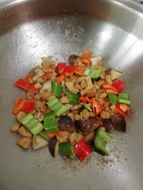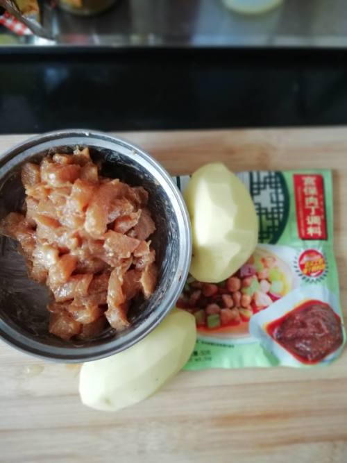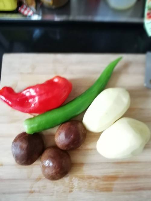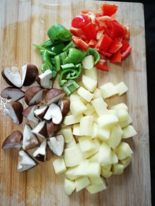 土豆、青椒、红椒、香菇,配菜切成丁。