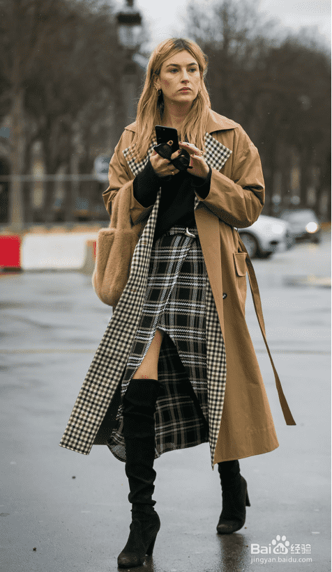 格纹元素充满了英伦风范,搭配长款风衣更添优雅学院风,半裙开叉一片式的设计又增添了成熟女人的妩媚,高腰的设计更能显得双腿修长。