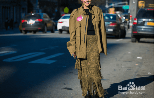 军绿色流苏半身长裙+黑色上衣+军绿色工装外套