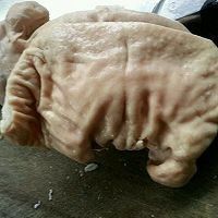 制作红烧猪肚子的材料:猪肚子、姜、大蒜、小葱、料酒、盐、菜子油、干辣椒段、少许的泡辣椒、少许的郫县豆瓣、花椒、大料、八角、鸡精。 先将猪肚子买回来洗净。