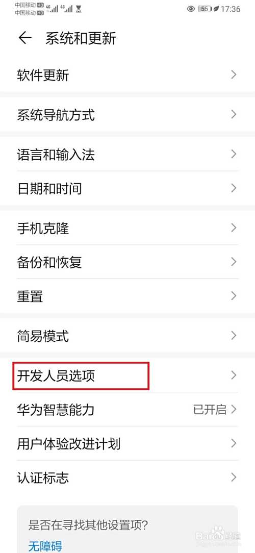 进入系统和更新页面,打开【开发人员选项】设置项。