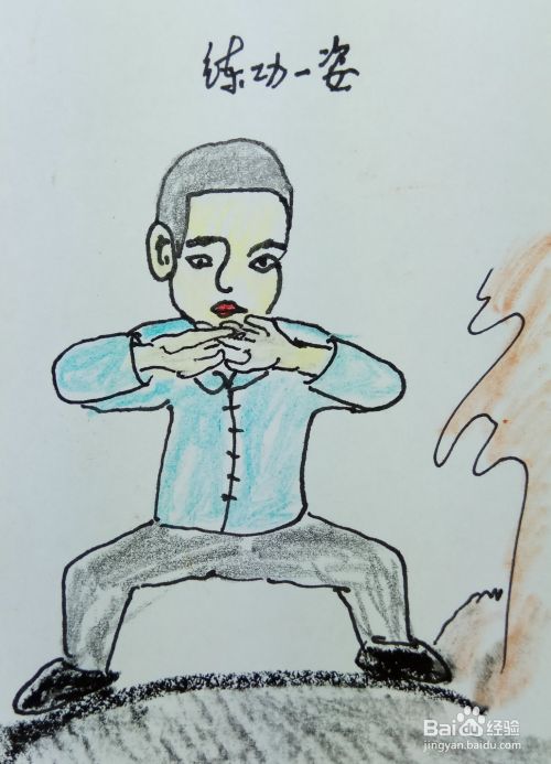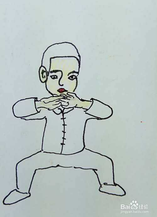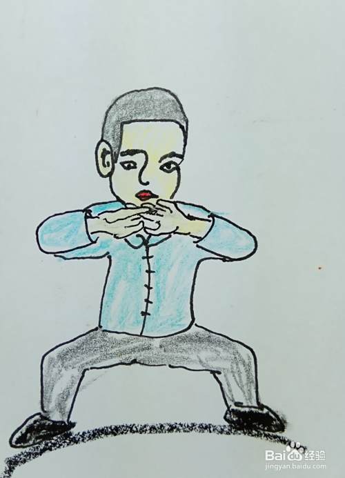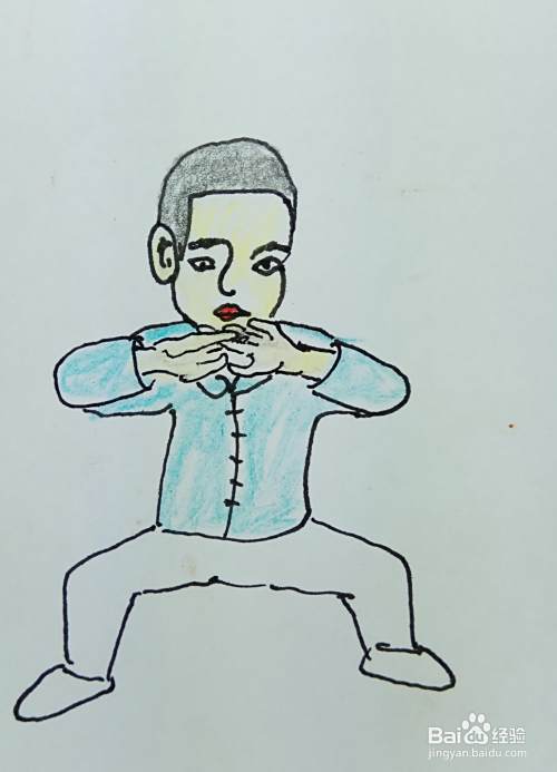 用浅红色的水彩笔涂出练功人的皮肤色彩,再用黑色的笔涂出练功人头发的色彩,用浅蓝色的色彩笔涂出他衣服的色彩。