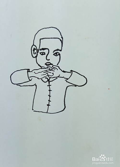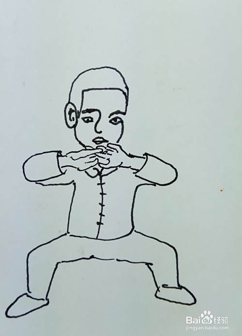 用曲线画出练功人的头部轮廓,并画出练功人的眼睛,鼻子,嘴巴,眉毛,耳朵和头发部分,这是一个正面动作,寥寥几笔就可以画出练功人的神态。