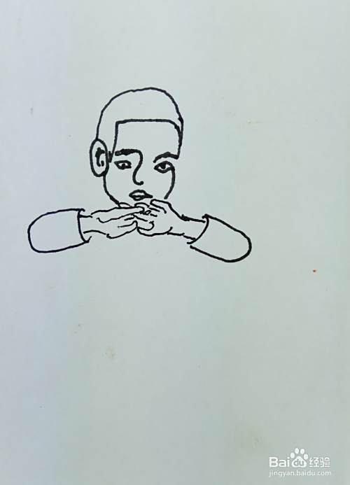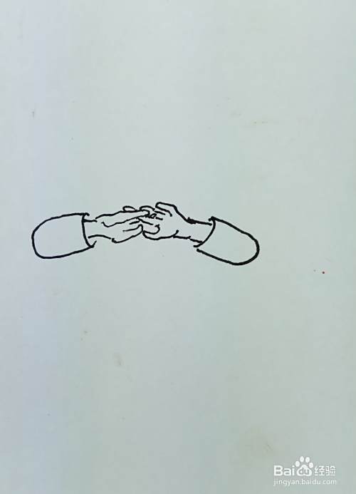 在白纸上用圆珠笔画出练功人的胳膊和手部,左右几乎是对称的状态,他的手搭在一起。