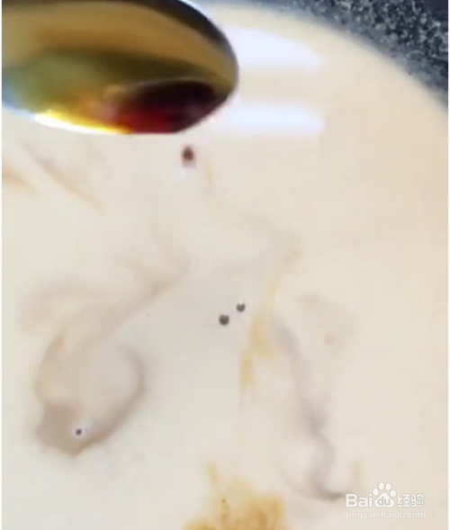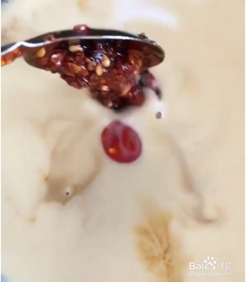 麻汁加适量温水搅拌开,加入盐、味精、陈醋、白糖、海天酱油,如下图。