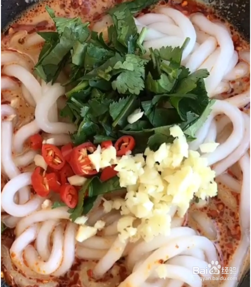 加入粉撒上香菜、辣椒、蒜末,如下图。