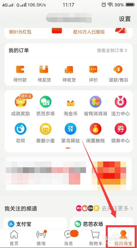 在淘宝界面的右下角,找到“我的淘宝”选项,点击进入我的界面。