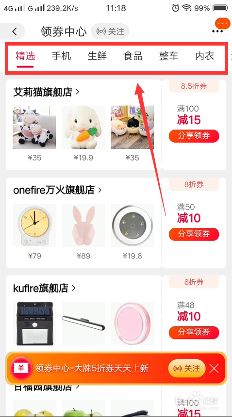 接着,我们在领券中心的上方,可以选择自己想要购买的东西的种类。