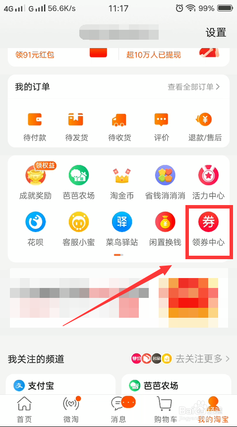 在我的淘宝界面中,我们可以找到“领券中心”的选项,点击进入领券中心界面。