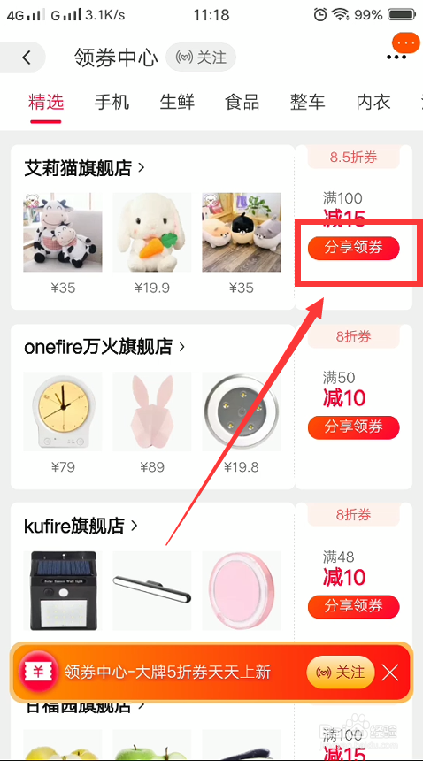 选择好类别以后,我们便可以挑选自己想要购买的东西,并点击“分享领券”即可领取购物券。