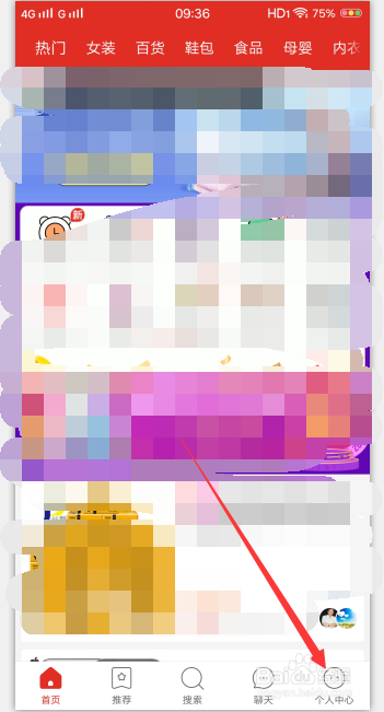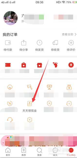 到了个人中心页面,显示自己的账号信息,以及订单详情等内容,点击下方的天天领现金模块。