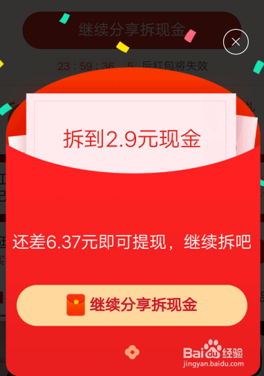 然后显示自己拆到一定数量的现金,一般都是10元以内,点击下方的分享后拆第2份现金。