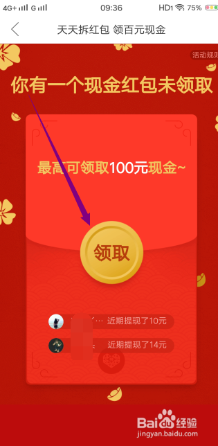 打开后,有个现金红包未领取的图片,点击中间的领取按钮,就跟抢红包一样。