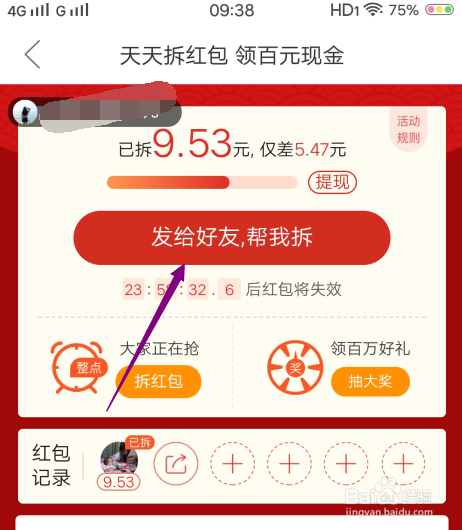 此时红包金额肯定是不足15元的,因为只有到了15元才可以提现,需要邀请好友来帮忙拆红包。