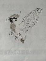 在麻雀的右侧翅膀用没骨画法画出,这只翅膀颜色较深。因为是背面向上。翅膀上还有点状的纹。在墨色将干的时候用重墨点上。让其自然渗化,产生出比较自然的效果。