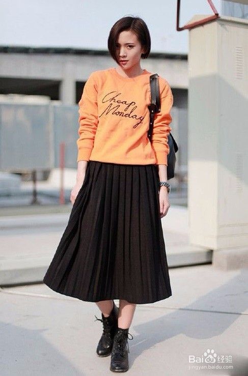 卫衣在之前的经验中也介绍过很多次了,时尚、休闲又百搭,这套橘色短款卫衣和黑色百褶裙的搭配也是十分洋气的。