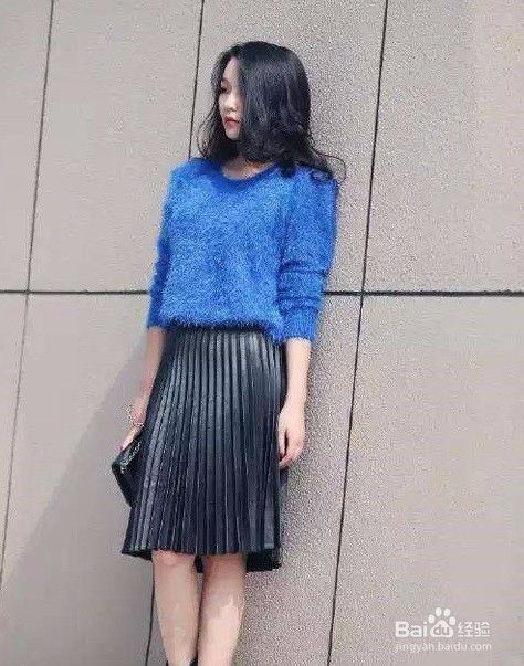 搭配三:黑色百褶裙+宝蓝色马海毛毛衣