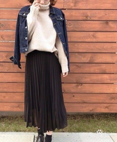 搭配四:黑色百褶裙+米色高领毛衣+牛仔外套