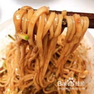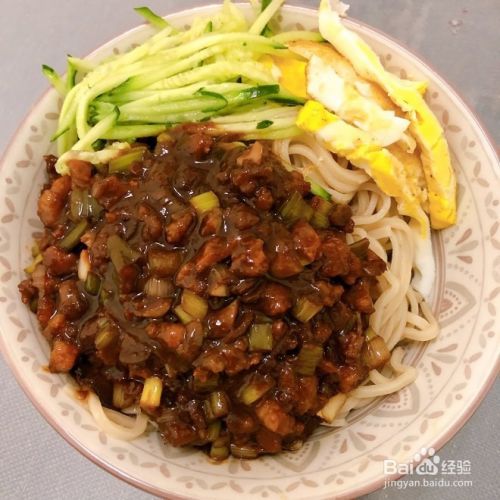 面条煮熟以后过冷水捞出,放入碗中。黄瓜切丝,鸡蛋摊饼,切条。如果鸡蛋用炒锅煎不好,可以直接打在电饼铛里煎。又薄又不会糊锅。黄瓜丝,鸡蛋条摆在面上,倒入炒好的酱。