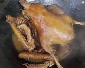 加一碗清水和少量冰糖,煮开后转中小火煮,中途经常翻动一下,让其上色均入味。翅膀、鹅脚、脖子、鹅头、鹅内脏太约半小时提前捞出来,鹅身继续煮,看到鹅腿的骨头差不多露出来时,放回翅膀、鹅脚、脖子、鹅头,加少量的蚝油翻动一下,此时试试味,不够咸再加一点点蚝油,小火焖煮一会,最后用筷子刺鹅腿最厚的肉处,孔没有液体流出已熟透。(全程要盖盖子,45~60分钟左右,视乎鹅的大小而定)