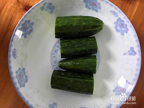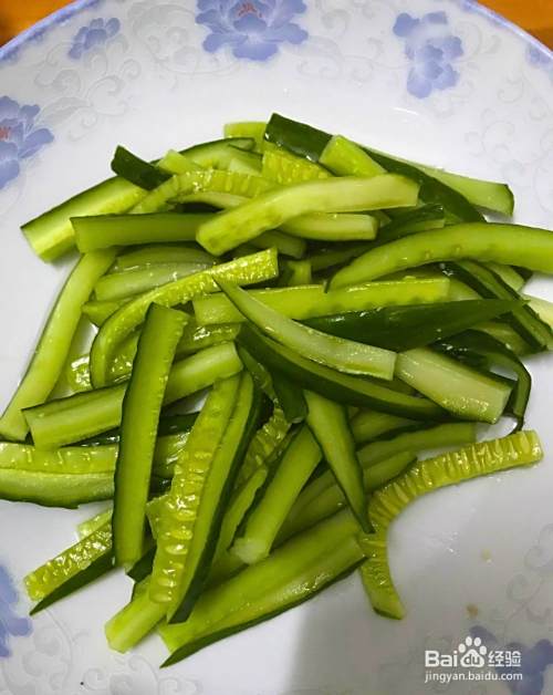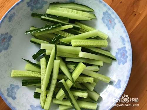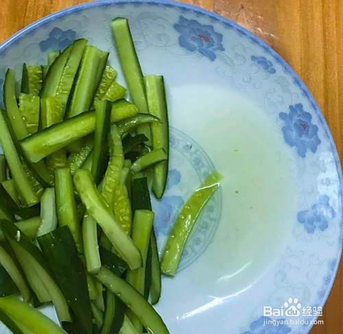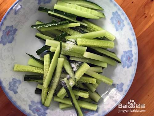 黄瓜放入少量的盐,腌2至3小时,待水分析出,沥干水分待用