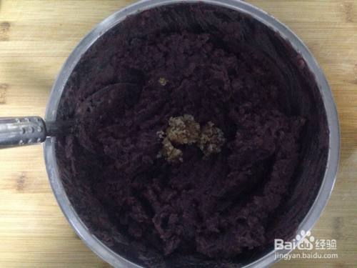 晾凉后,用勺子将红豆压成泥,并加入适量桂花糖搅拌均匀。