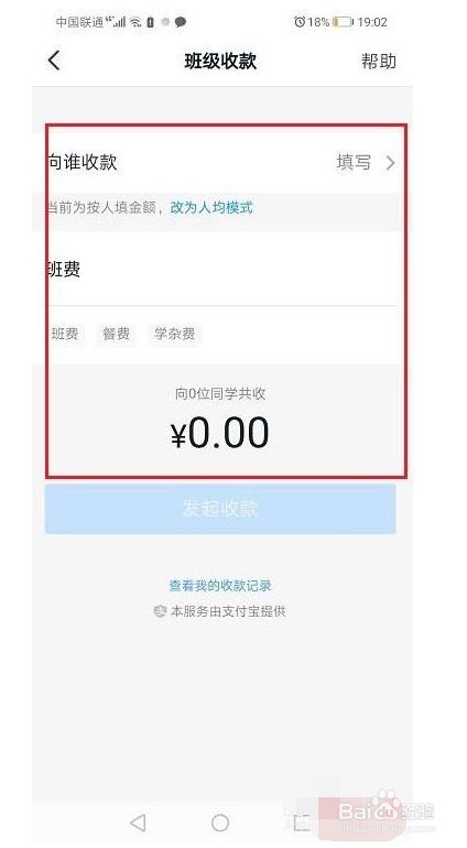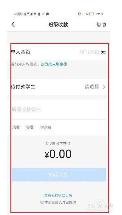 第二步打开班级收款之后,默认是人均模式,每位同学收取一样的金额,适用于收取班费,餐费等,如下图所示: