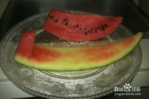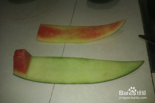 1把一个西瓜竖切成半,取半边西瓜的4分1片,把红色瓜肉切出。