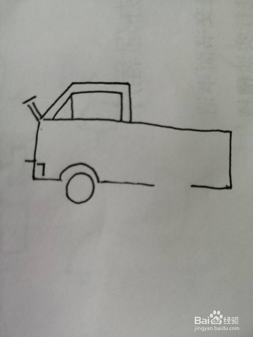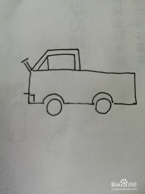 第四步,接着在小货车的雨刮器的后面画出一条短竖线,小货车的车窗就画好了。