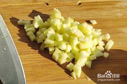 准备苹果一个,糯米粉三勺,白糖一勺,清水两勺,面包糠小半碗。苹果洗净去皮,对半切开,再把里边的果核去除,先切成片,然后再切成小丁