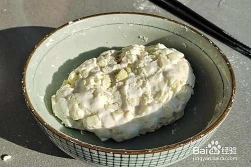 先用筷子将糯米粉和苹果丁搅拌均匀,再下手将它们揉成团,揉好的面团偏软,不过只要能捏成团就行了