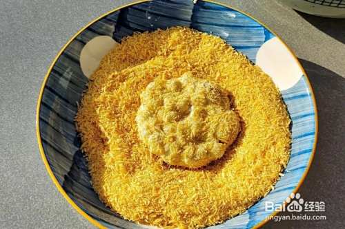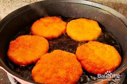 揪一块面团下来,先搓圆,然后再将它压成小饼,放入面包糠中,两面均匀的沾上一层面包糠,挨个将剩余的面团全部做好