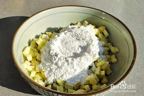 把切好的苹果小丁放入碗中,接着加入三勺糯米粉,两勺清水,增加黏性,再来一勺子白糖,增加甜味
