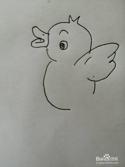 第六步,然后继续画出可爱的小鸭子的一只翅膀,注意翅膀上花纹的画法。