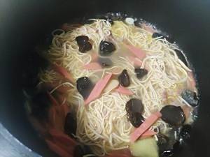 加入干丝和火腿肠,继续煮2分钟,千万不要放盐,咸肉的咸味够了。