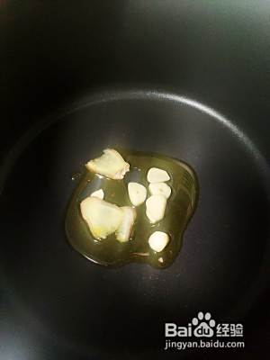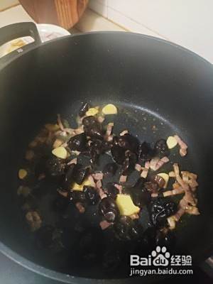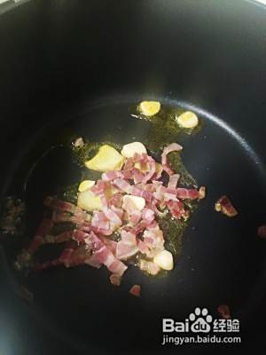 起锅烧油,放入姜蒜爆香。放入咸肉翻炒30秒。