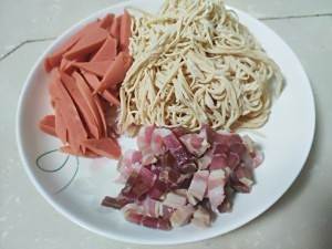 火腿肠和咸肉切丝,煮干丝买的超市现成的,也可以自己买白干或者厚百叶切丝。