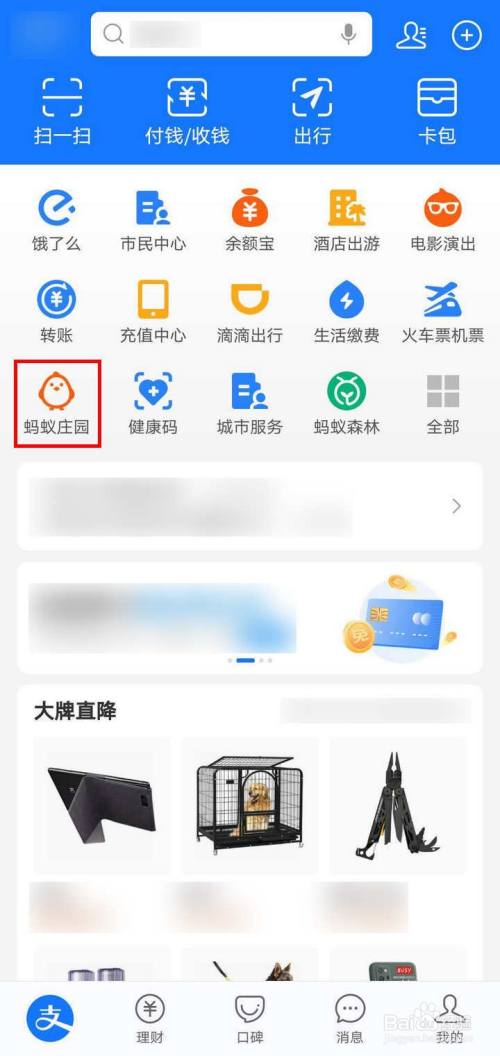 打开支付宝首页,常用应用入口在页面上方,下方则是推荐商品,点击应用中的蚂蚁庄园;
