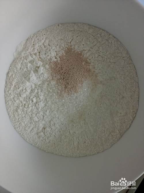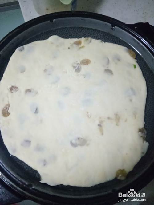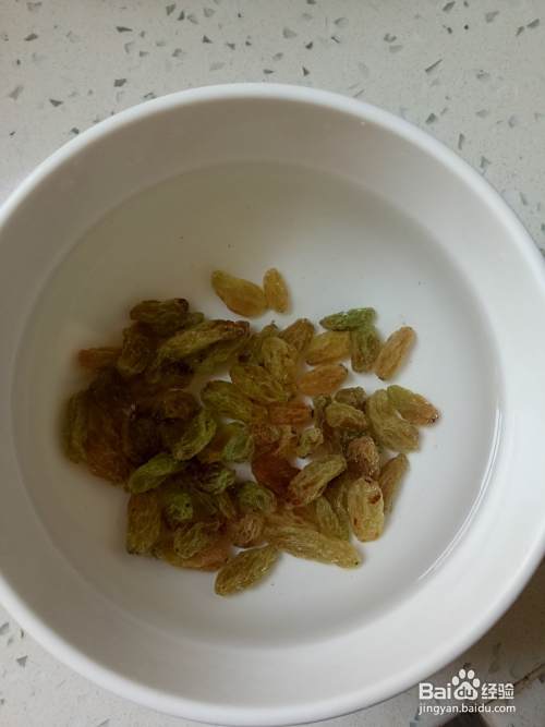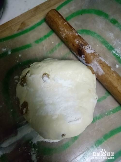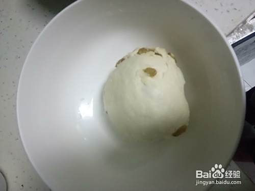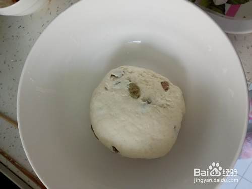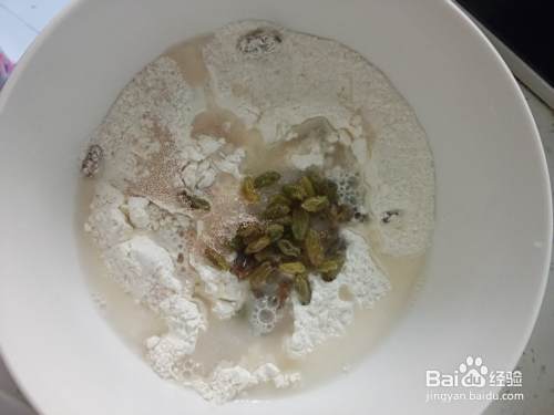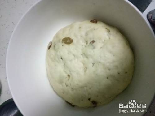 取适量的葡萄干,在水中浸泡一会后清洗干净,控干水分。一个大碗中加入适量的面粉、发酵粉、白砂糖、葡萄干、清水搅拌成面絮后揉成光滑的面团。面团揉好后盖上保鲜膜,让其发酵至两倍大左右。