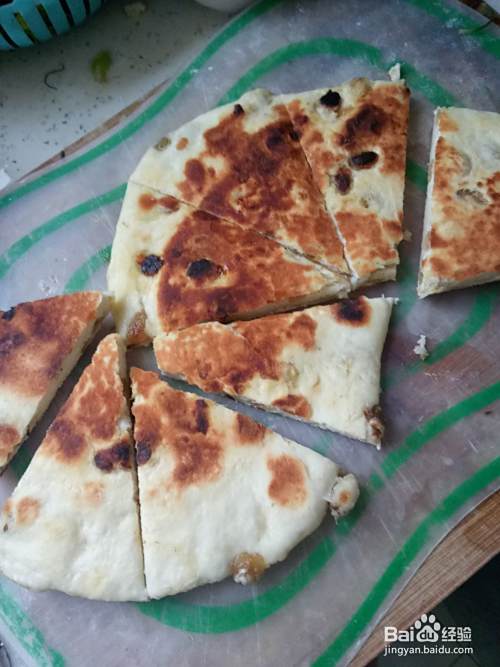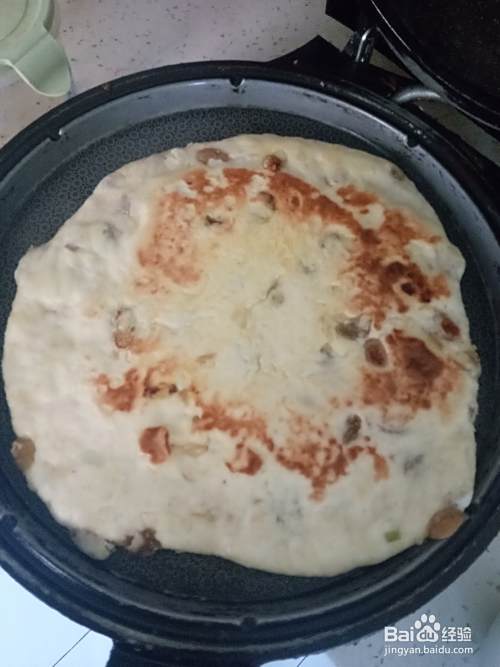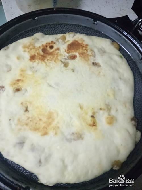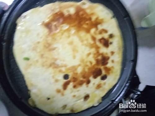 电饼铛预热刷油后把饼放在电饼铛内,盖上盖子焖一会,待一面微黄后翻另一面,两面微黄后时不时地翻面,让其均匀受热,待饼的两面烙至金黄后就可以取出放在面板上,切成合适的大小,开吃!