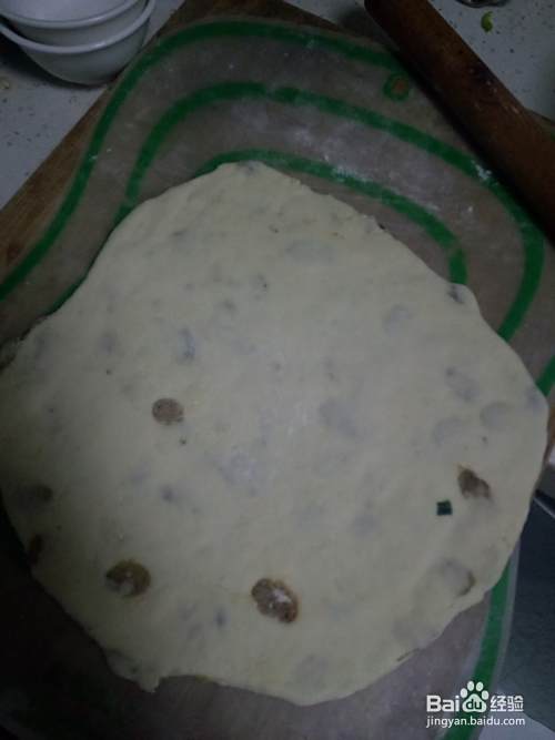 面发好后再次揉成光滑的面团,把面团放在面板上擀压成薄的面饼。这个面饼擀出来的形状要适合自己家的电饼铛。