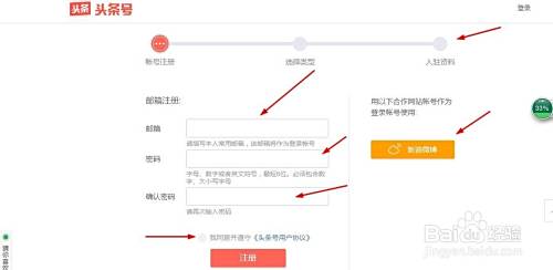 输入常用邮箱,密码,再次输入密码,勾选上“我同意关遵守《头条号用户协议》”,点注册。进入以下页面。