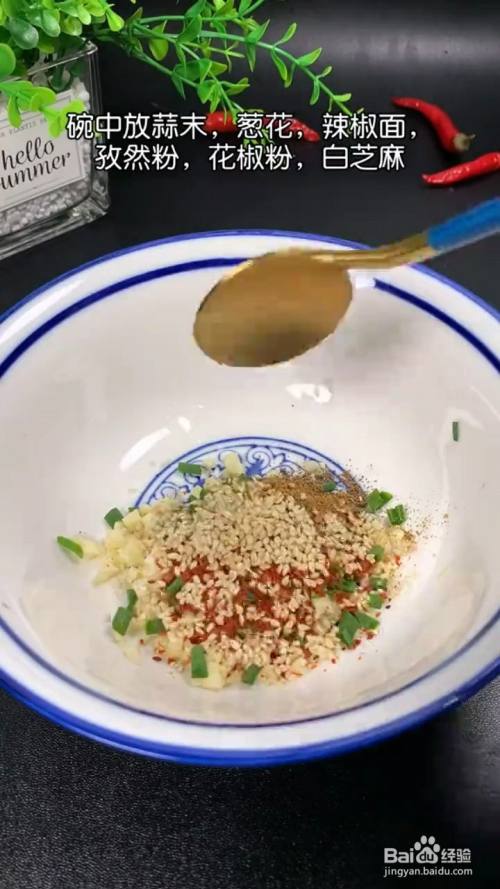 碗中放入蒜末、葱花、辣椒面、孜然粉、花椒粉、白芝麻、热油。