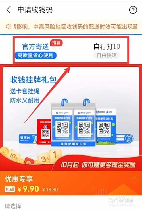 这里可以选择上方的【官方寄送】选项,也可以选择【自行打印】选项,根据页面提示申请或保存收钱码即可。