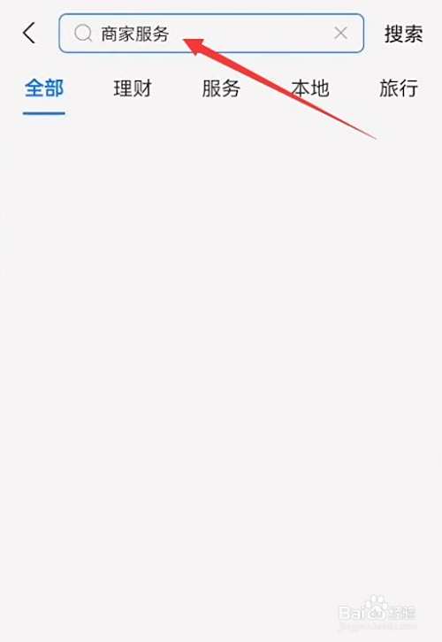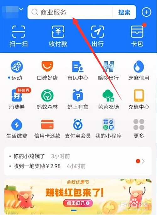 然后点击首页面上方的【搜索栏】,在搜索栏搜索“商家服务”。
