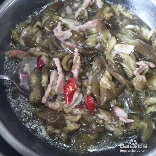 等瘦肉腌制入味后,用筷子均匀地夹放到茄子上面。
