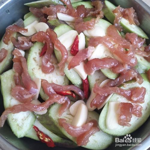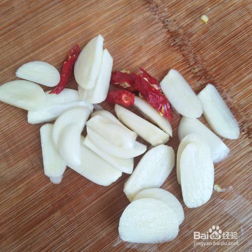 大蒜洗净去掉外衣,小米椒洗净一起切成片状放到茄子上面。