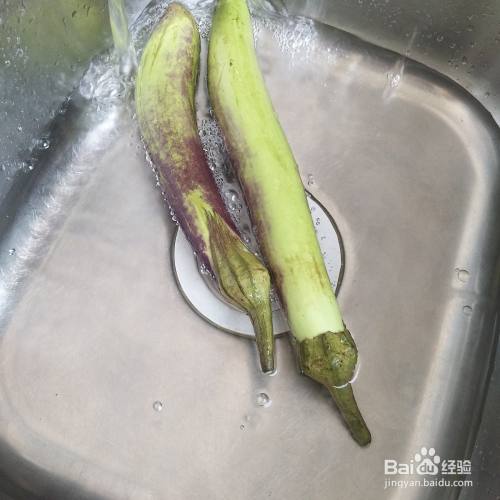 购回新鲜的茄子两个,清洗干净后切成大片形状。