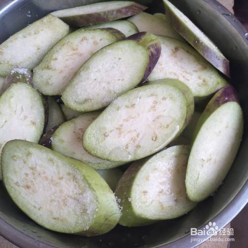 将切好的茄子装入盘中,在茄子上方均匀地撒上食盐。